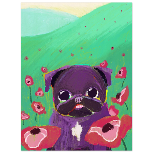 Whimsical Black Pug Poster - 'In The Poppies" Art Print on Premium Matte Paper