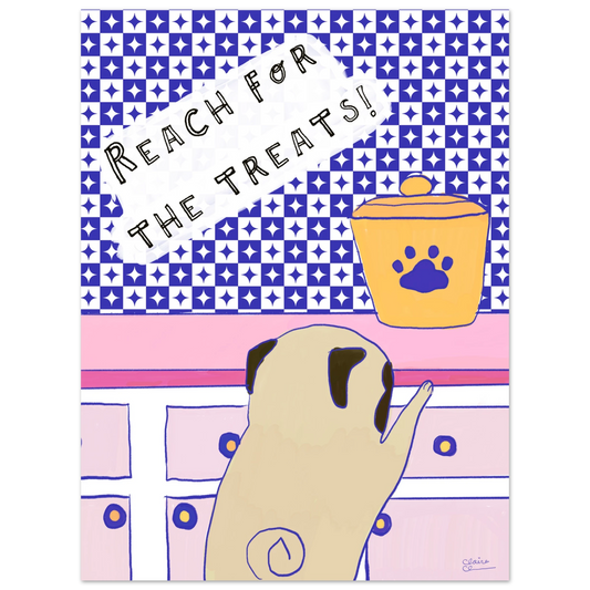Whimsical Pug Poster - 'Reach for the Treats!' Playful Kitchen Art Print