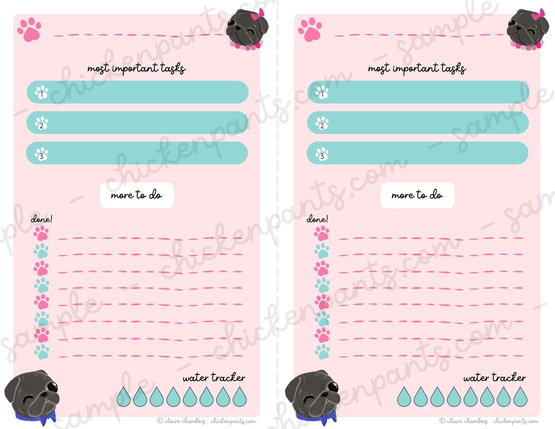 Bring pug cheer to your daily planning! This undated daily planner page will have you on top of everything in style. It features highlighted space for your three most important tasks of the day, as well as space for additional tasks and a water tracker. Print out as many copies as you wish - no worries about messing them up or running out!