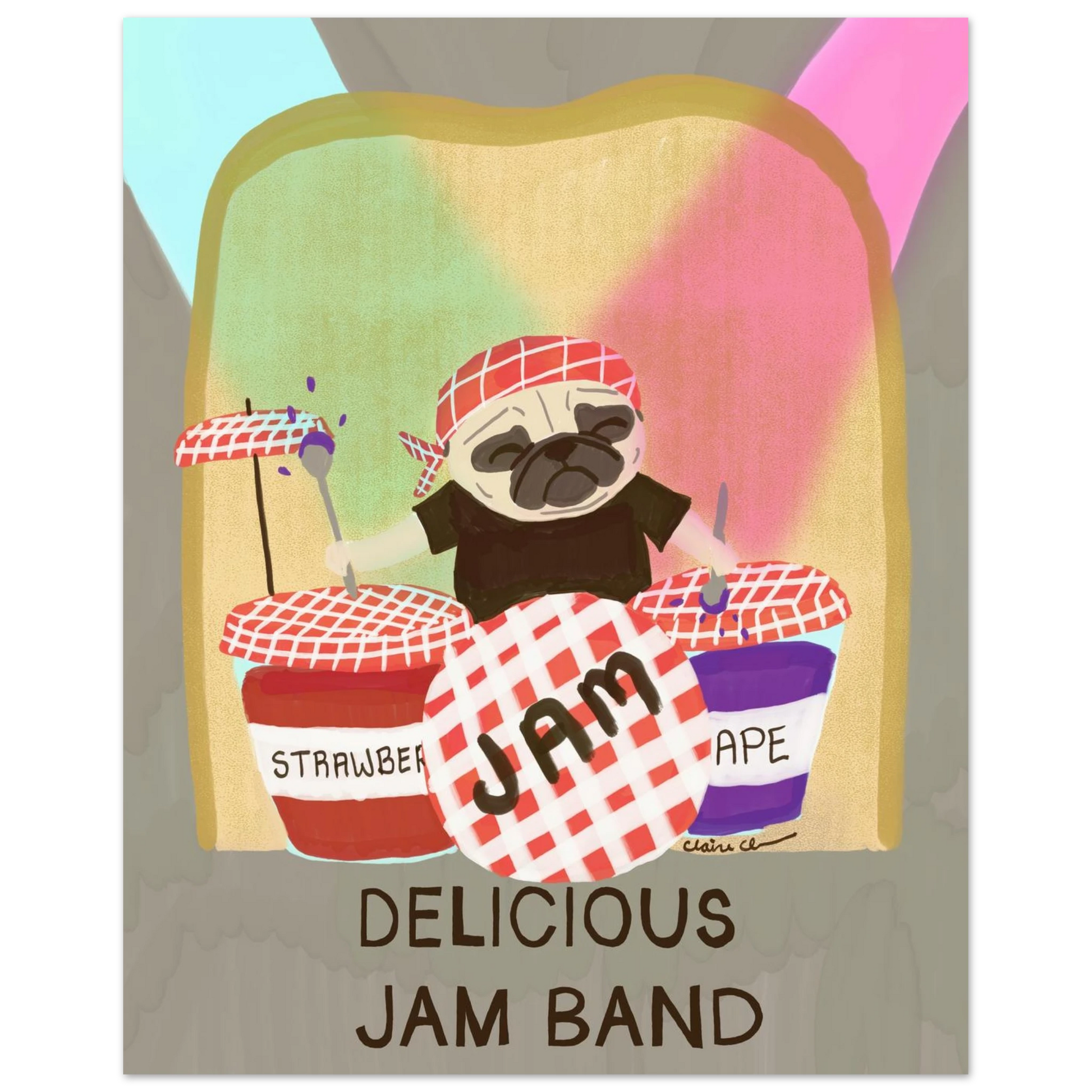 Introducing our whimsical Delicious Jam Band Poster, featuring a delightful illustration of a pug playing drums on jam jars. This playful piece is sure to add charm and humor to any space.