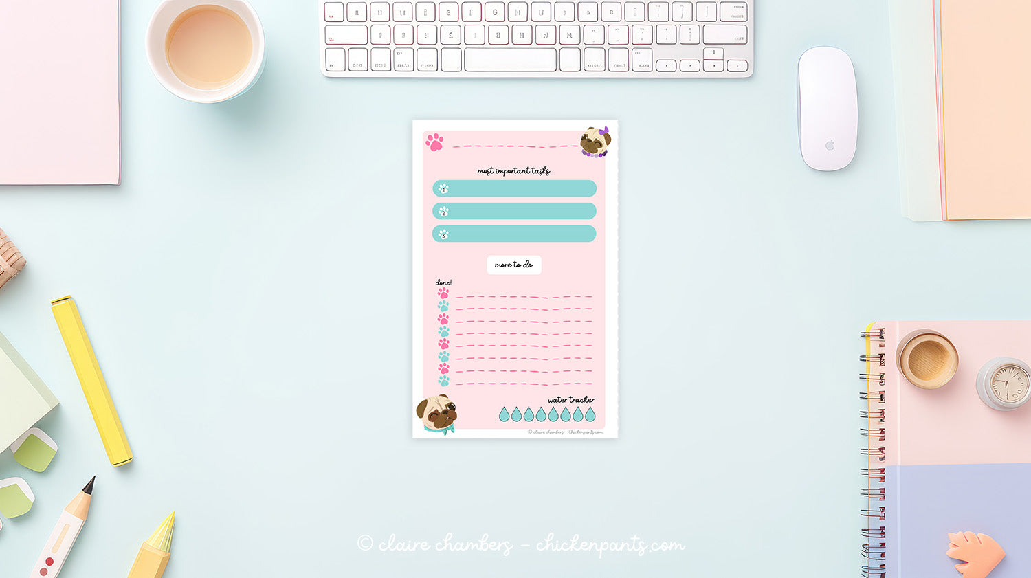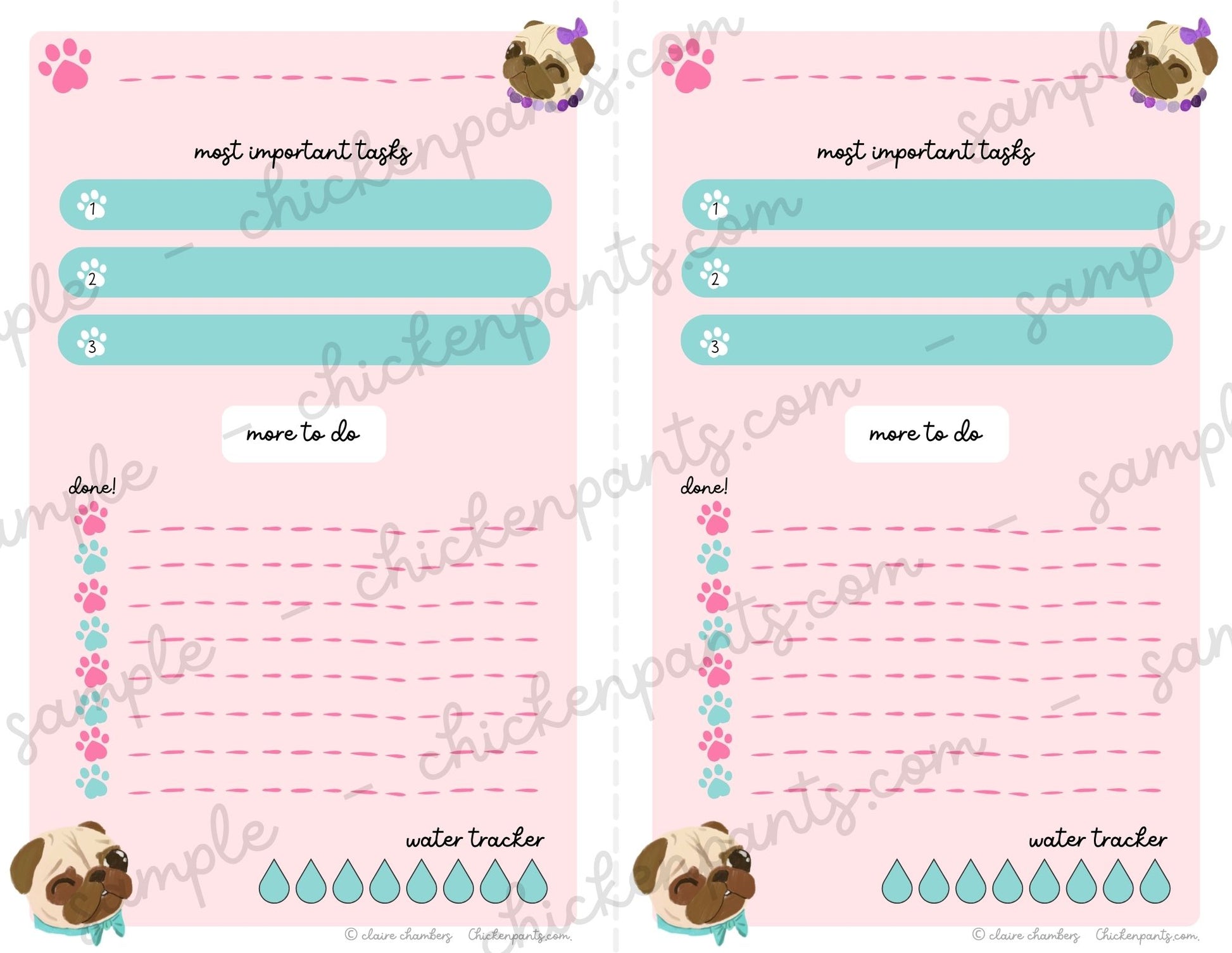 Bring pug cheer to your daily planning! This undated daily planner page will have you on top of everything in style. It features highlighted space for your three most important tasks of the day, as well as space for additional tasks and a water tracker. Print out as many copies as you wish - no worries about messing them up or running out!