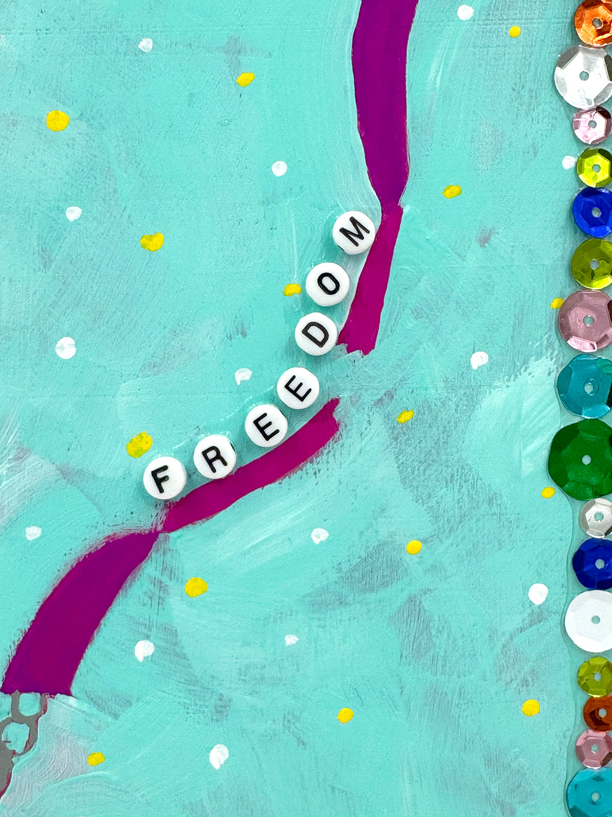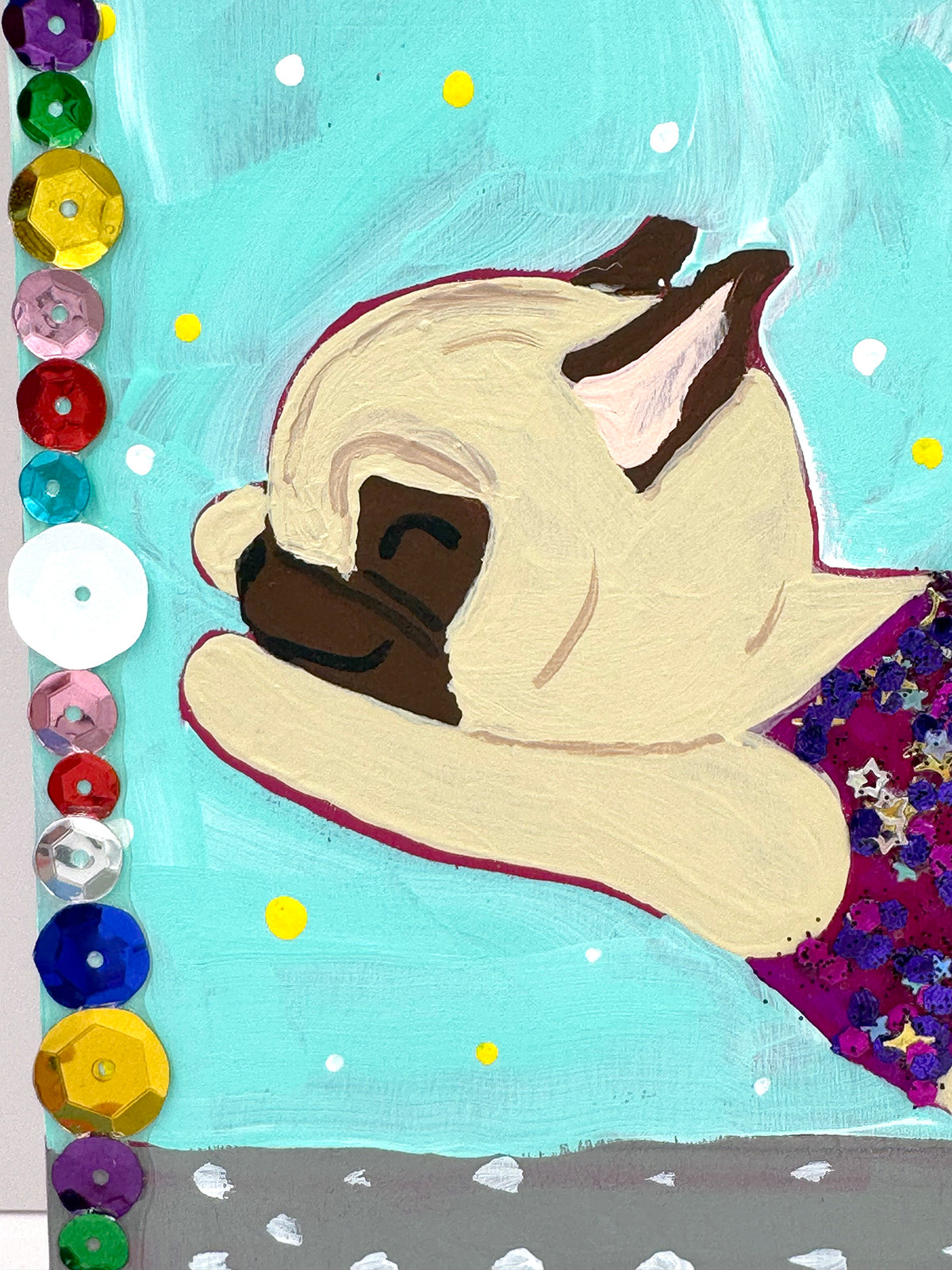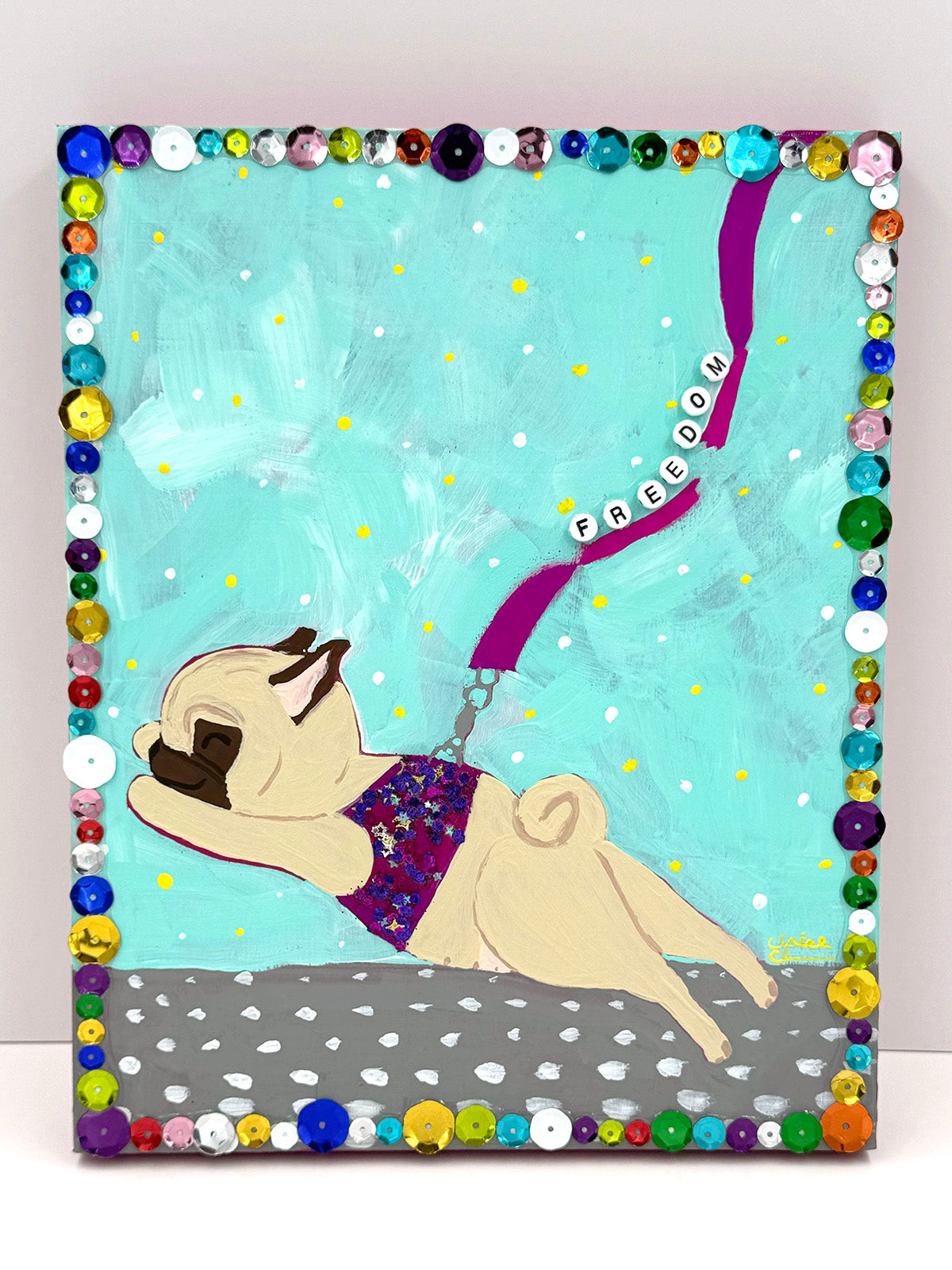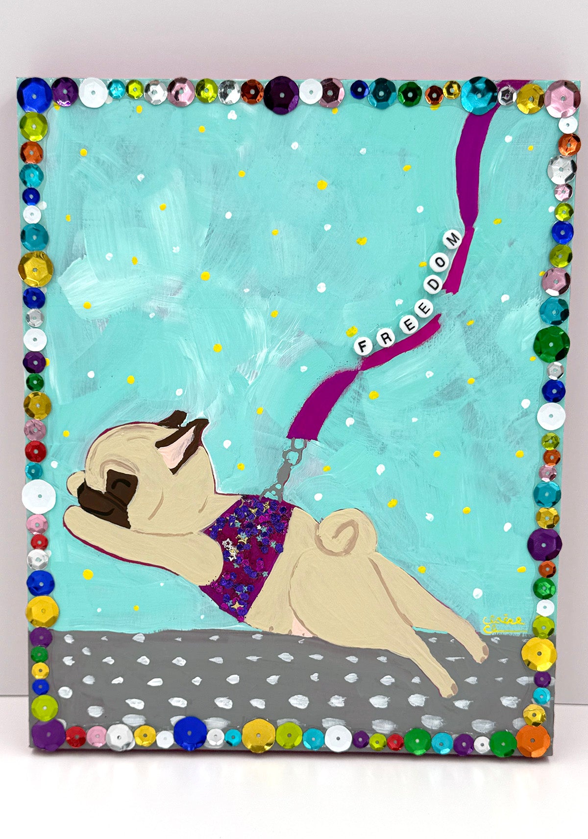 ☆ It features a glittering harness on the pug, letter beads selling out "freedom", and a glittering "frame" of sequins all around the front edge.