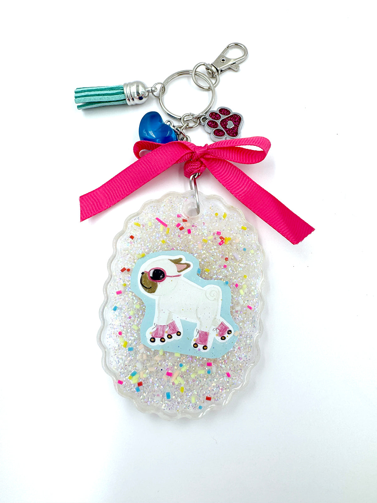 ☆ This is an original cast resin bag charm made by me. It's the only one in the whole world! Each one is totally unique, and features a little micro print of one of my paintings, a bow, extra little charms, and a joyful sprinkle of glitter!