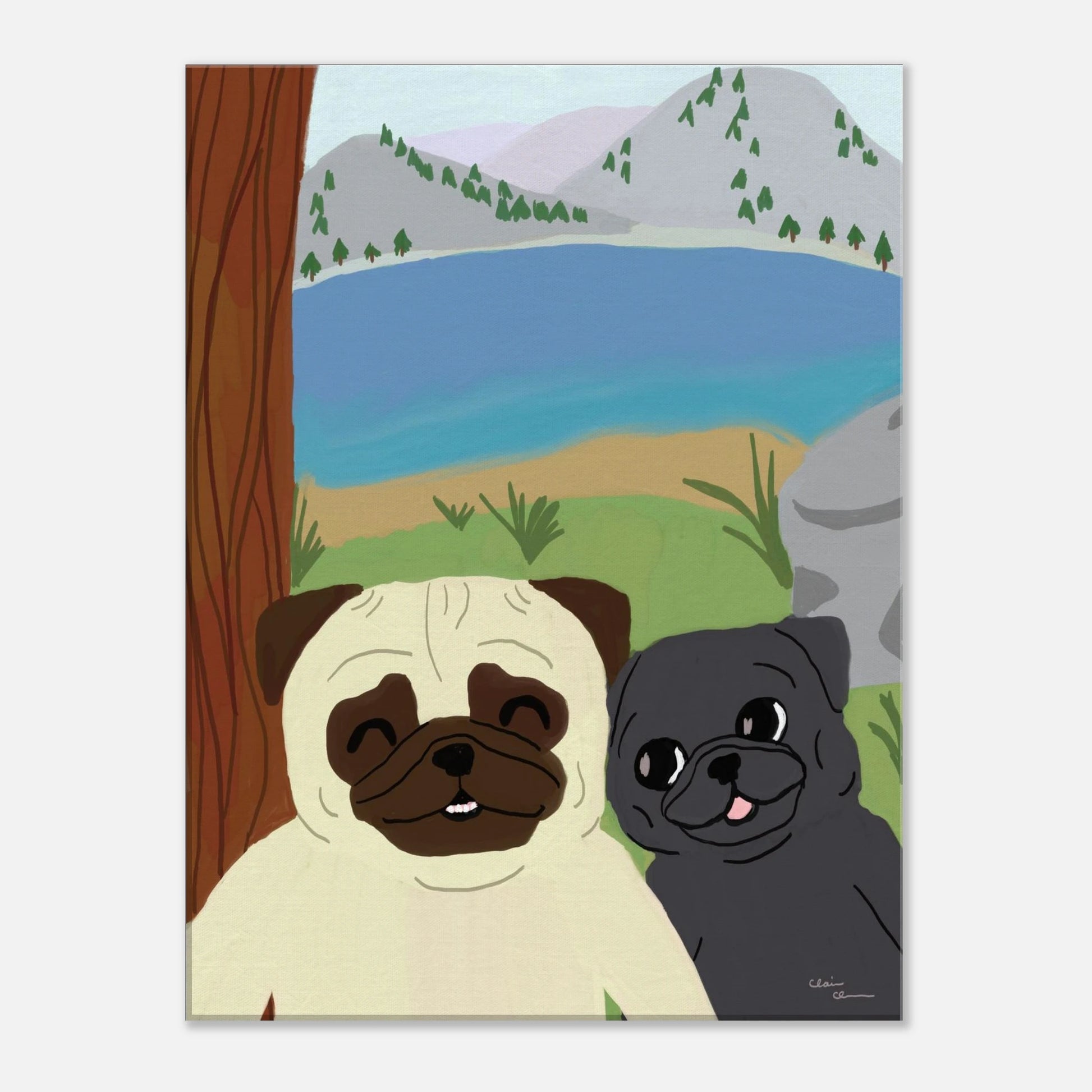 Transform your space with our vibrant canvas print titled "Selfie By The Lake". This delightful artwork captures the playful spirit of two pugs enjoying a serene moment by the lake, making it a perfect statement piece for dog lovers and art enthusiasts alike.