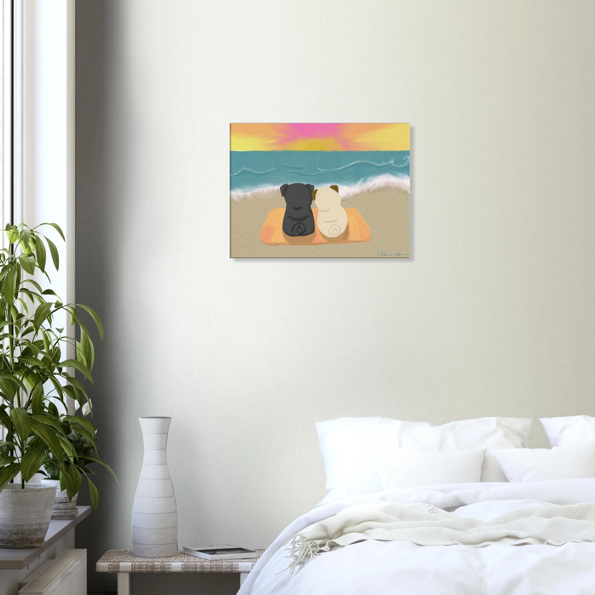 Bring a touch of warmth and companionship to your space with our enchanting canvas print featuring a sweet painting of two pugs sitting on the beach, watching the sunset together. This delightful artwork captures the essence of togetherness and serenity, making it a perfect addition to any home.