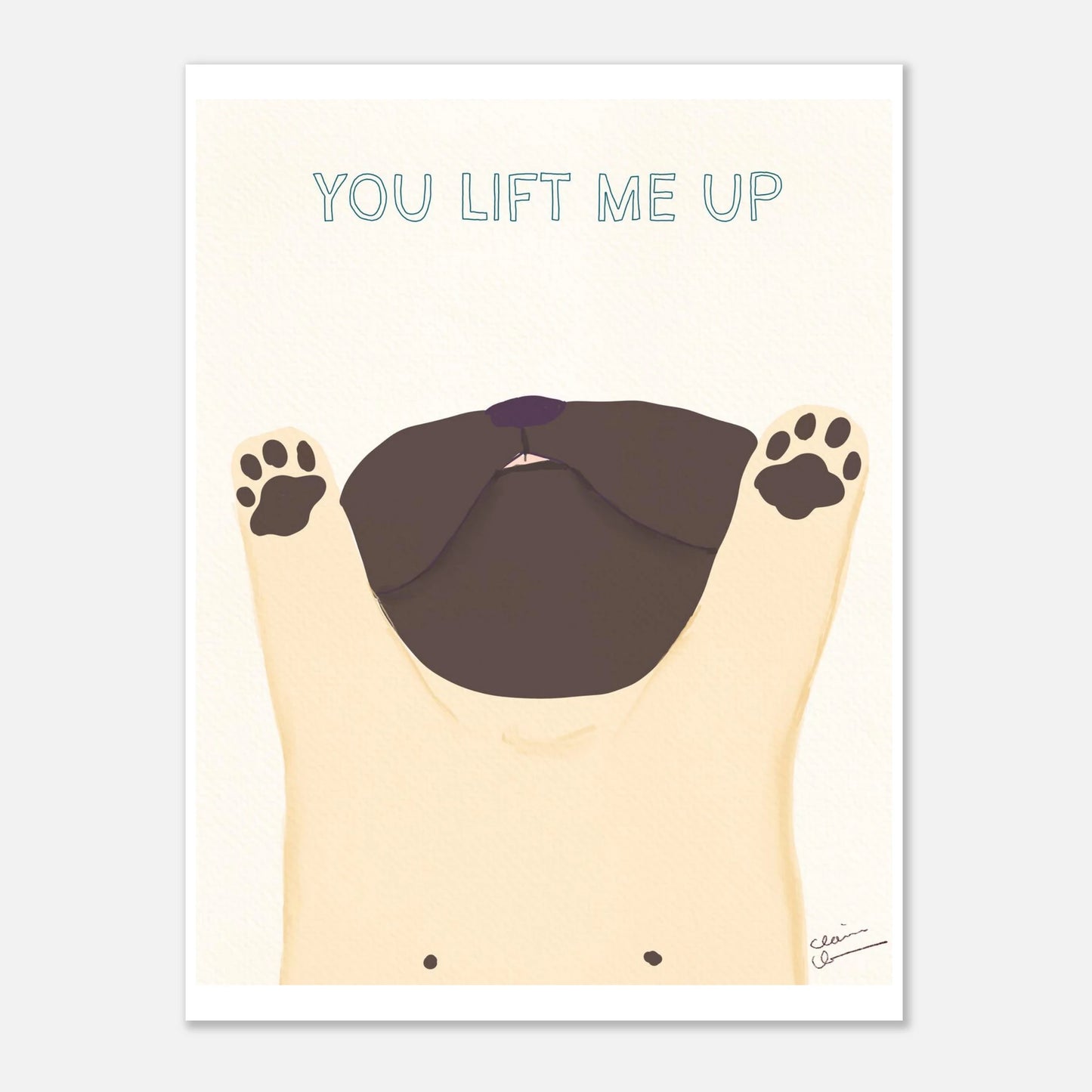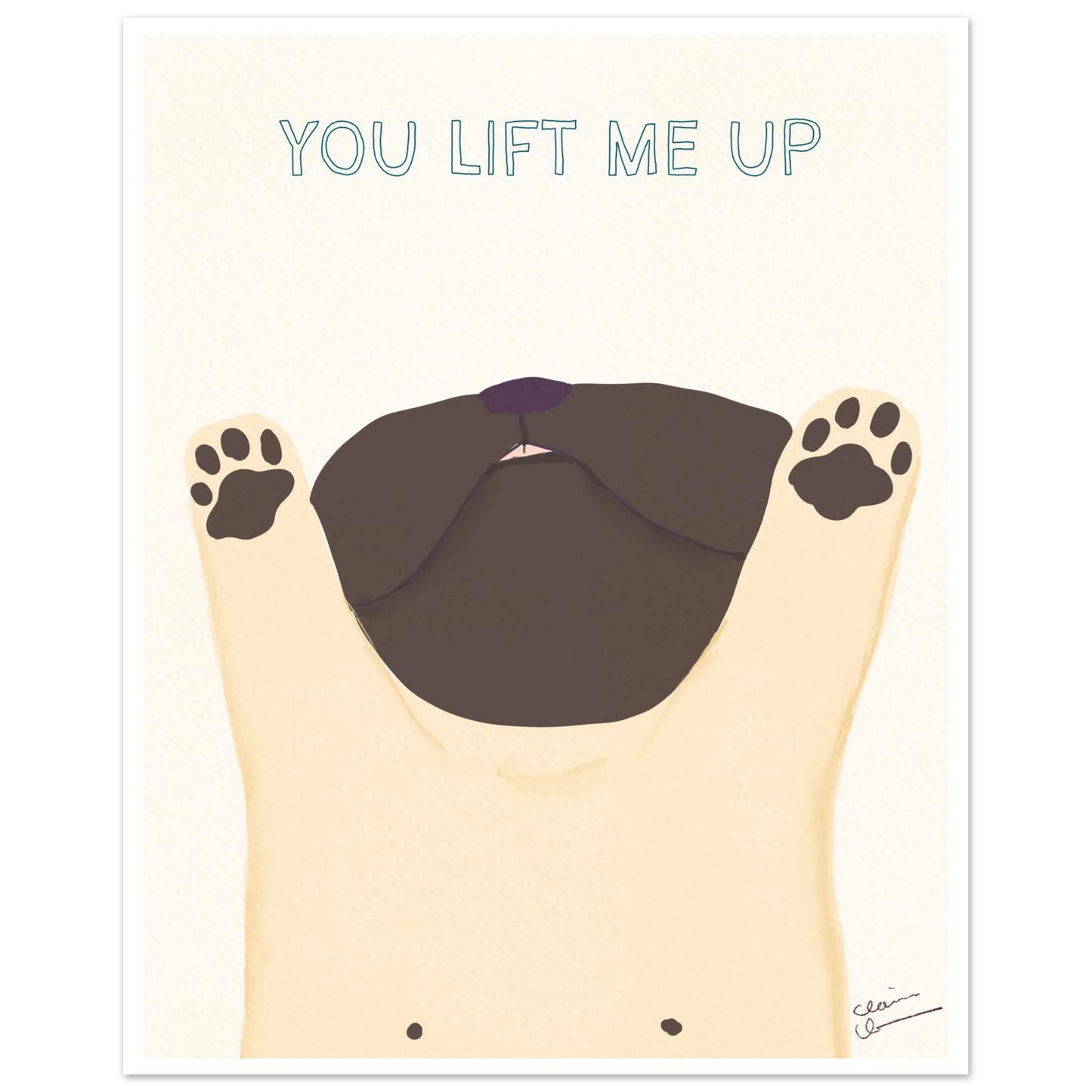 Bring joy to your space with our charming You Lift Me Up Pug art print, featuring an adorable portrait of a pug with its arms raised, capturing the essence of love and companionship.